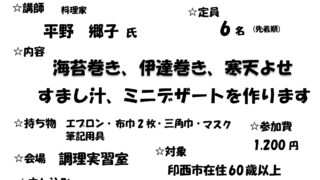 「食」は元気の源です。 健康で充実した毎日を送っていただく為に趣向を凝らしたテーマの料理教室を開催しています。